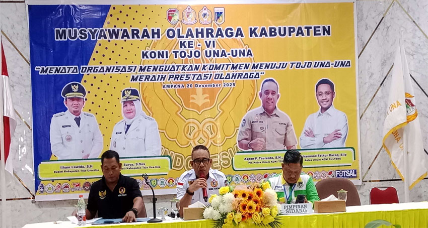 TOJO UNA-UNA, t-media.id — Bupati Tojo Una-Una, Ilham, S.H., terpilih secara aklamasi sebagai Ketua Komite Olahraga Nasional Indonesia (KONI) Kabupaten Tojo Una-Una dalam Musyawarah Kabupaten (Muskab) VI yang digelar di Hotel Lawaka, Ampana, Minggu (21/12/2025).