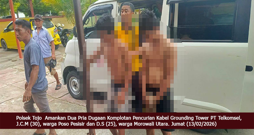 TOJO, t-media.id | Kepolisian Sektor Tojo menangkap dua pria yang diduga terlibat pencurian kabel grounding tower milik PT Telkomsel di Desa Tongku, Kecamatan Tojo, Jumat pagi, 13 Februari 2026. Penangkapan dilakukan sehari setelah polisi lebih dulu mengamankan seorang terduga pelaku lainnya.