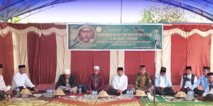 t-media.id, Tojo Barat – Bupati Tojo Una-Una yang di wakili oleh Pj. Sekretaris Daerah Kabupaten Tojo Una-Una, Alfian Matadjeng menghadiri sekaligus membuka dengan resmi Madrasah Diniyah Awaliyah (MDA) Alkhairaat dusun IV Tanambi Desa nggawia yang di rangkaikan dengan Pengukuhan Pengurus Cabang Alkhairaat Kecamatan Tojo Barat, Minggu (20/07/2025)
