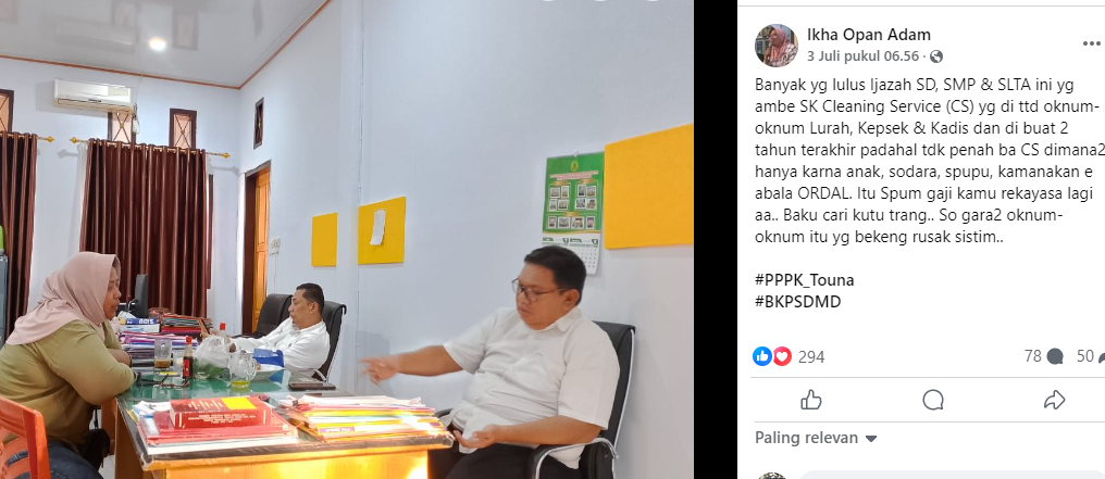 Salah satu tokoh muda Touna Nuratika Iriansi, kumandangkan aksi sorot tajam dugaan adanya praktik manipulasi dokumen seperti yang terjadi pada tahap seleksi pegawai pemerintah dengan perjanjian kerja (PPPK) pada tahap sebelumnya ungkapnya melalui Platform Facebook “Ikha Opan Adam”.