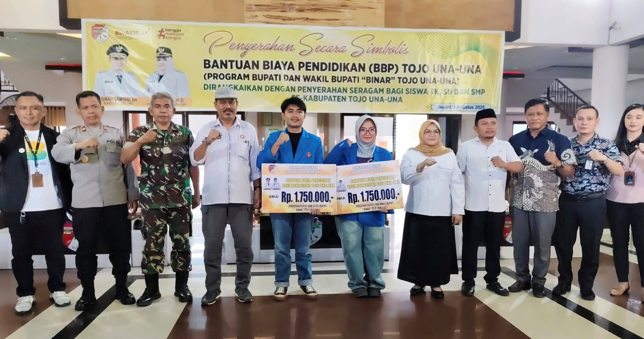 Wakil Bupati Tojo Una-Una, Hj. Surya Lapasiri, secara simbolis menyerahkan bantuan tersebut pada Jumat, 1 Agustus 2025, di Lobi Kantor Bupati. Acara ini dihadiri oleh unsur Forkopimda, pimpinan OPD, kepala sekolah, orang tua siswa, mahasiswa, serta tokoh masyarakat setempat.